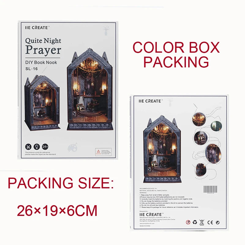Transform your bookshelf into a scene of serenity and gothic elegance with the SL16 DIY Book Nook Kit – Quiet Night Prayer. This miniature diorama captures the beauty of a cathedral at night, complete with intricate gothic-style architecture and a peaceful church interior. Perfect for book lovers, crafters, and collectors, it’s a stunning display piece that combines creativity, craftsmanship, and artistry.