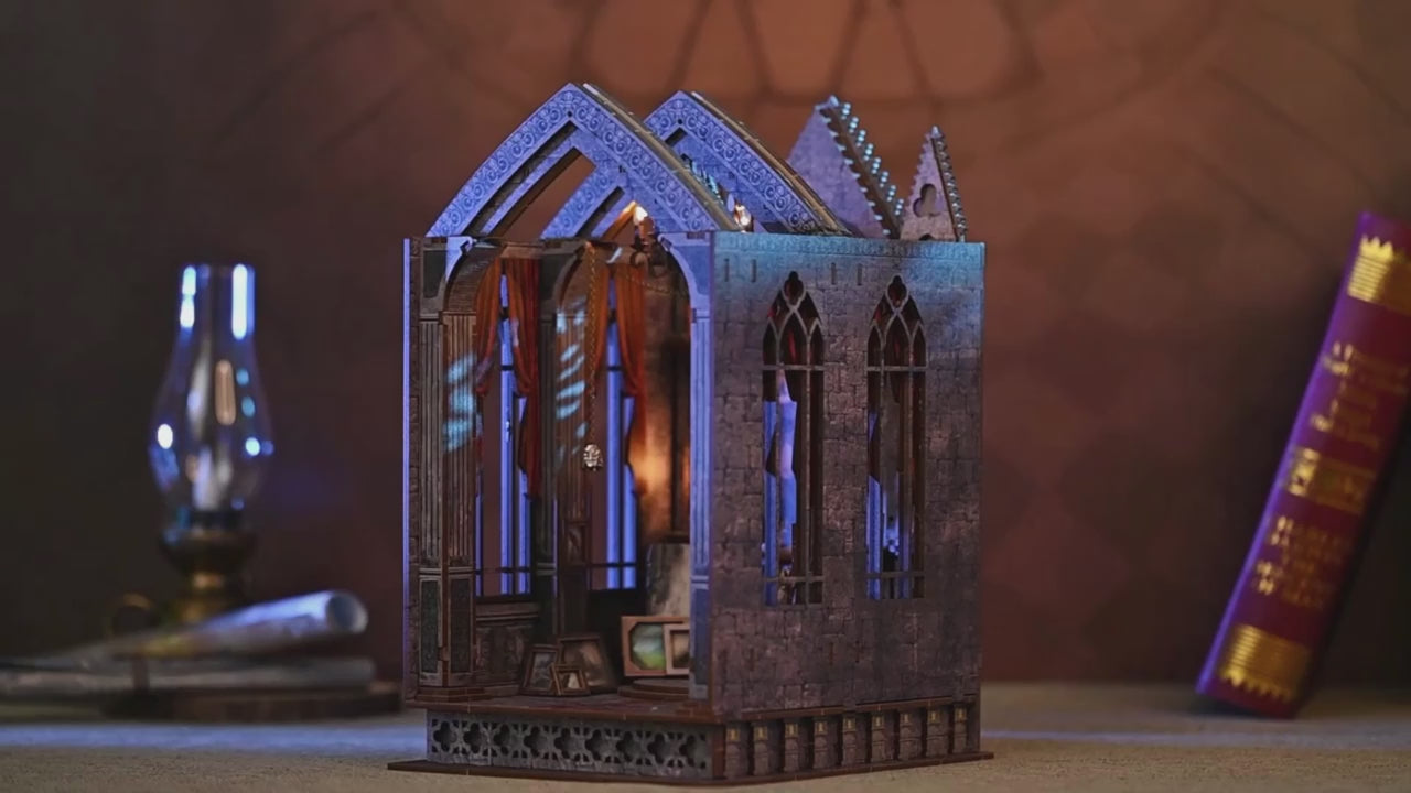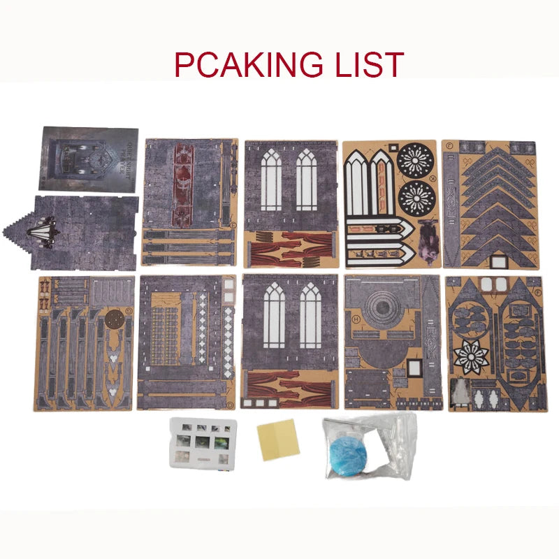 The kit includes all the materials needed for assembly along with clear instructions to guide you through the process. Glue and batteries are not included due to airmail restrictions, so please have them ready before you begin. Once completed and illuminated, this gothic cathedral book nook radiates a warm, spiritual glow that brings the scene to life.